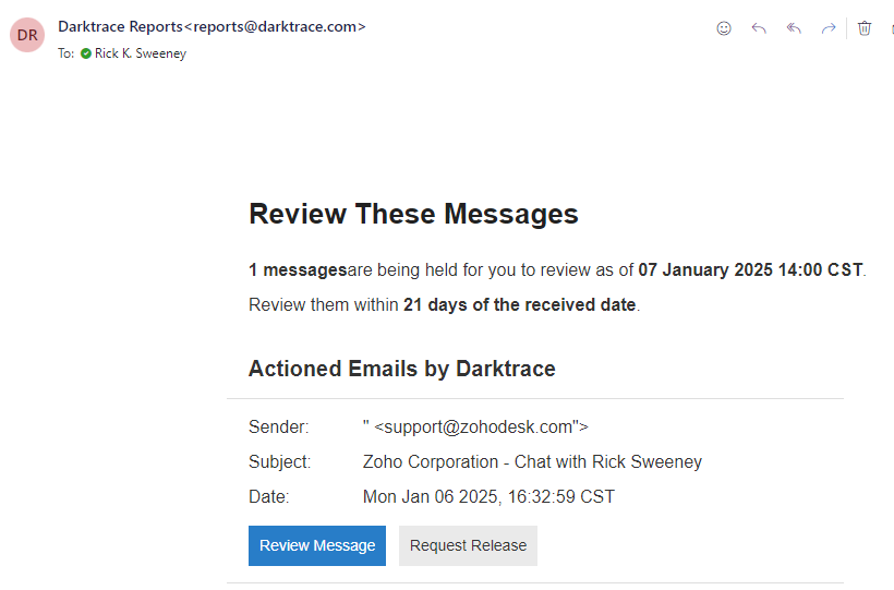 Held Email Notification - Darktrace