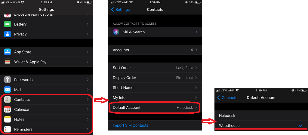 You will also need to set your default “Contact” and “Calendar”. This is done in the same way you set your default “Mail” account.