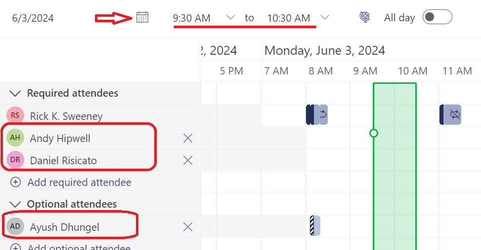 - Select the date and time you wish to have a meeting. Add the members, both required and optional. You will see if their time is blocked out or free. You can also select a Teams meeting or a room resource if you need.
